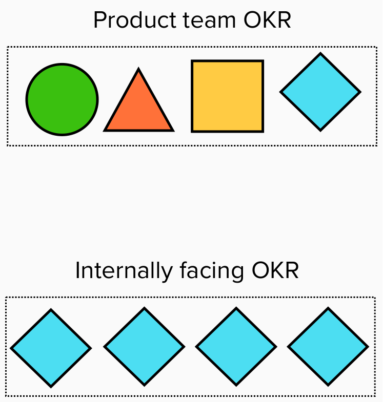 When we think about these horizontal disciplines as service providers there are only two ways their work can be accounted for with Objectives and Key Results. The first option is to include them as part of the product development team’s goals. In other words, the product team’s OKRs are the service team’s OKRs as well. The designers, communication folks or platform engineers function as a real part of the product team. Their goals are the team’s goals. They win or lose together. There is no division between the “product” goals and the “service team” goals. They work together, as a cohesive unit, to make the product better.
