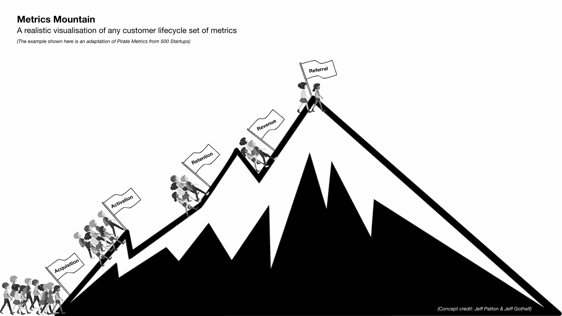 In the image above I’ve chosen the popular Pirate Metrics framework from 500 Startups to illustrate Metrics Mountain however you can use any metrics framework that makes sense to your work, customer workflow or domain.