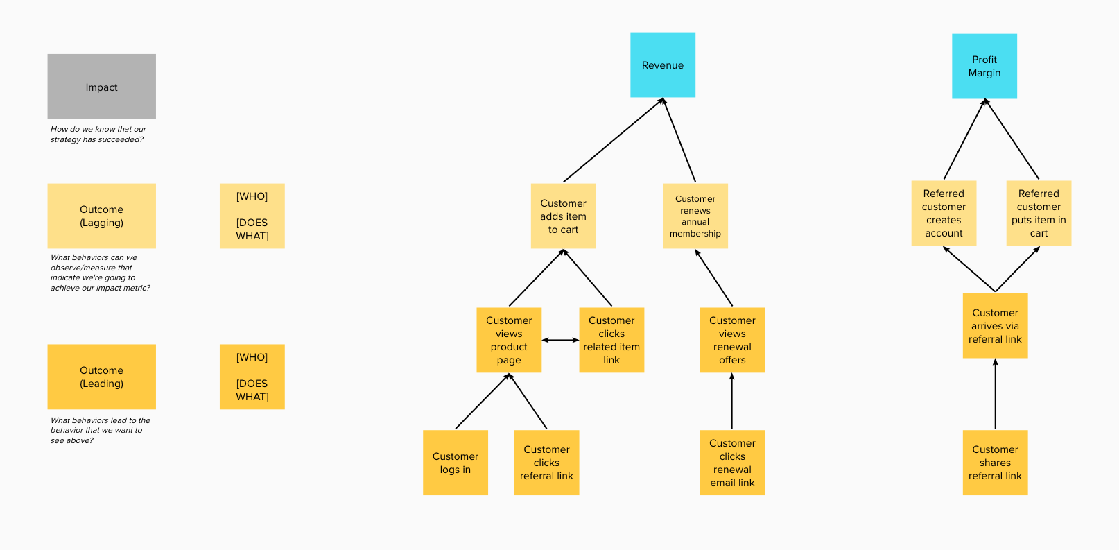 In this exercise you are visualizing the explicit connection between what customers do in the system and how the company makes money. You’re doing this without mentioning any kind of specific features or launches. The conversation you are mapping is focused exclusively on the customer, their actual behavior in the product and the various ways that impacts the organization’s impact metrics – the high level measures of the health of the business.